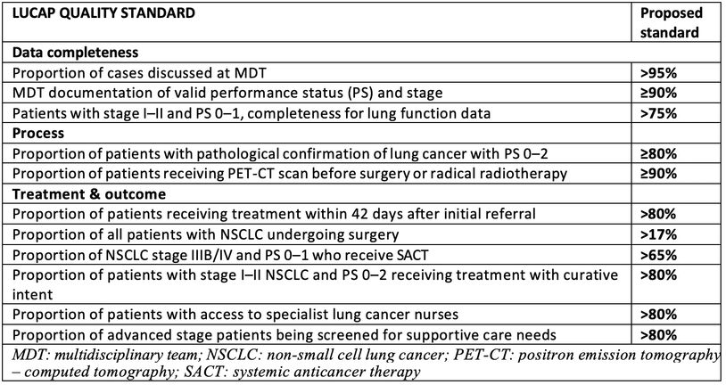 Where appropriate, case-mix adjusted proportions of key measures will be presented after statistical adjustment for measures such as age, sex, lung function, smoking status, performance score, cancer stage and socioeconomic status. Multivariable linear regression models will determine the probability that the result is significantly different from the national mean. Data will be presented as a case-mix adjusted percentage and the results further illustrated as funnel plots.